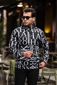 Beyaz Harf Desenli Siyah Renk Spor Model Kumaş Mont